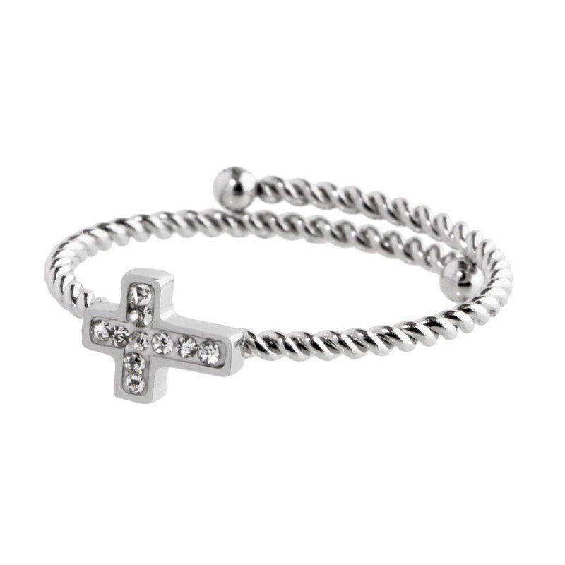 Anello in acciaio, ritorto, regolabile, con al centro una croce con cristalli bianchi. Materiali: acciaio, cristalli