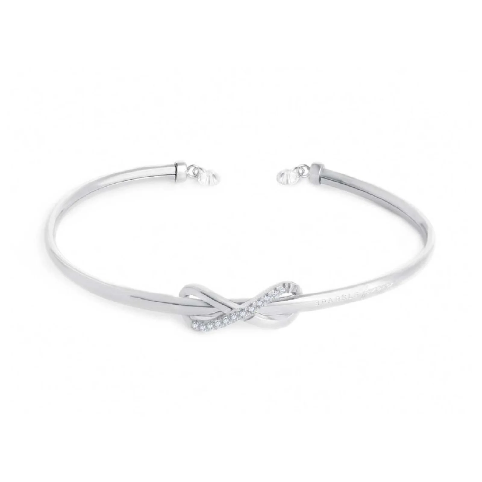 Bracciale rigido in acciaio con al centro un infinito con cubic zirconia bianchi. A lato dell’infinito è presente incisa la scritta “SPARKLE forever”. Su entrambe le estremità un cubic zirconia di diametro 4,00 mm. Logo Marlu inciso sul lato inferiore su un’estremità . Materiali: acciaio, cubic zirconia