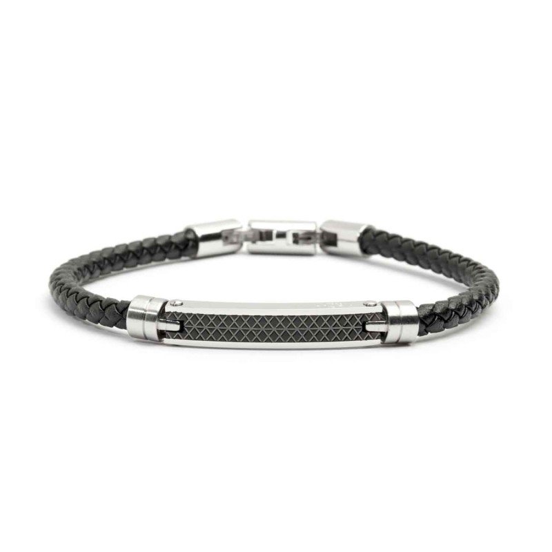 Bracciale pelle nero 4mm e targa in acciaio con inserti smalto nero con doppia chiusura ,21 cm regolabile Collezione Man Class 23
