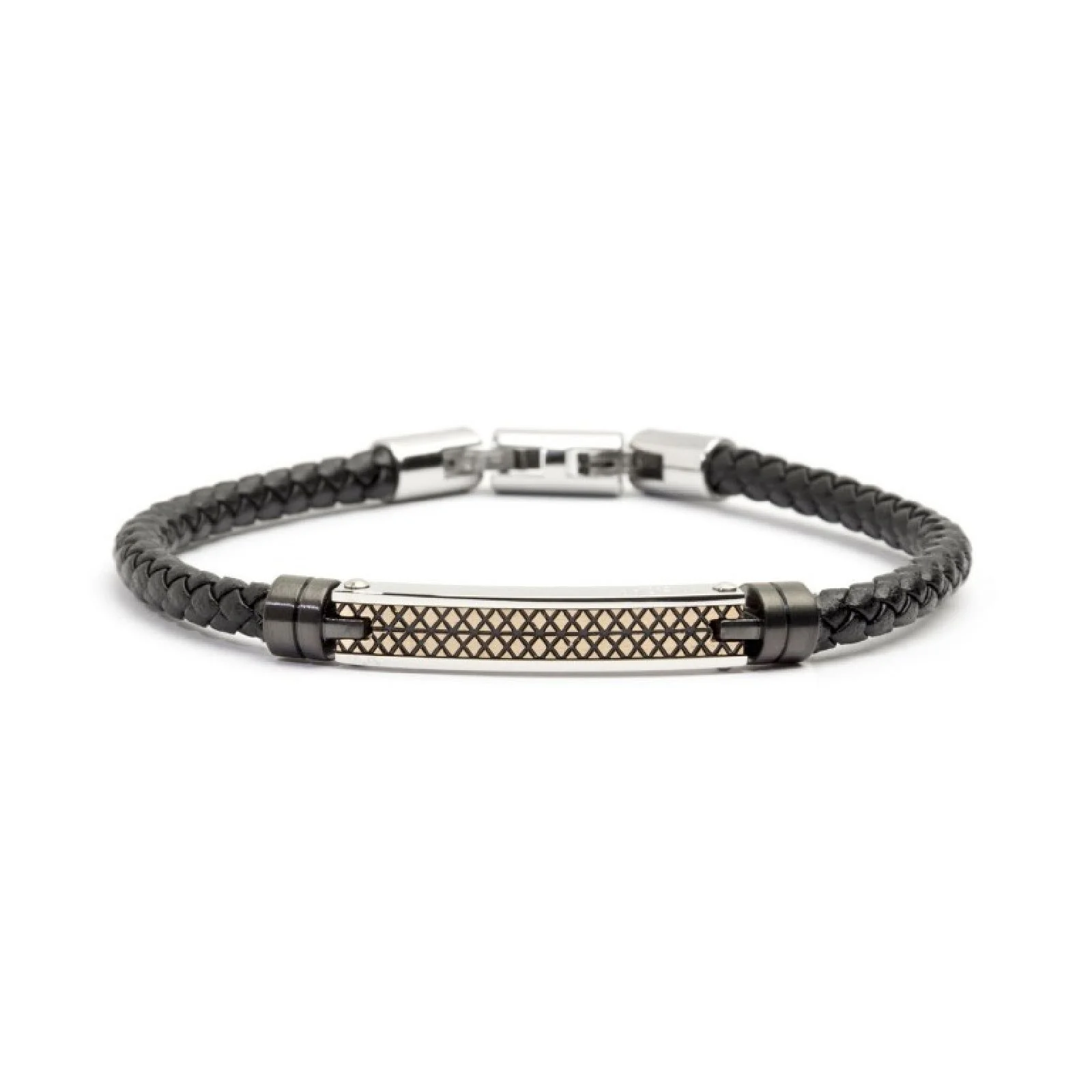 Bracciale in pelle della collezione Marlù Man Class da uomo. Colore: nero, argento e oro rosa. Il gioiello è in acciaio inossidabile 316L con trattamento pvd oro rosa, composto da giro di pelle nera intrecciata e dettaglio centrale oro rosa rifinito con smalto nero. Lunghezza regolabile tramite doppia chiusura.
