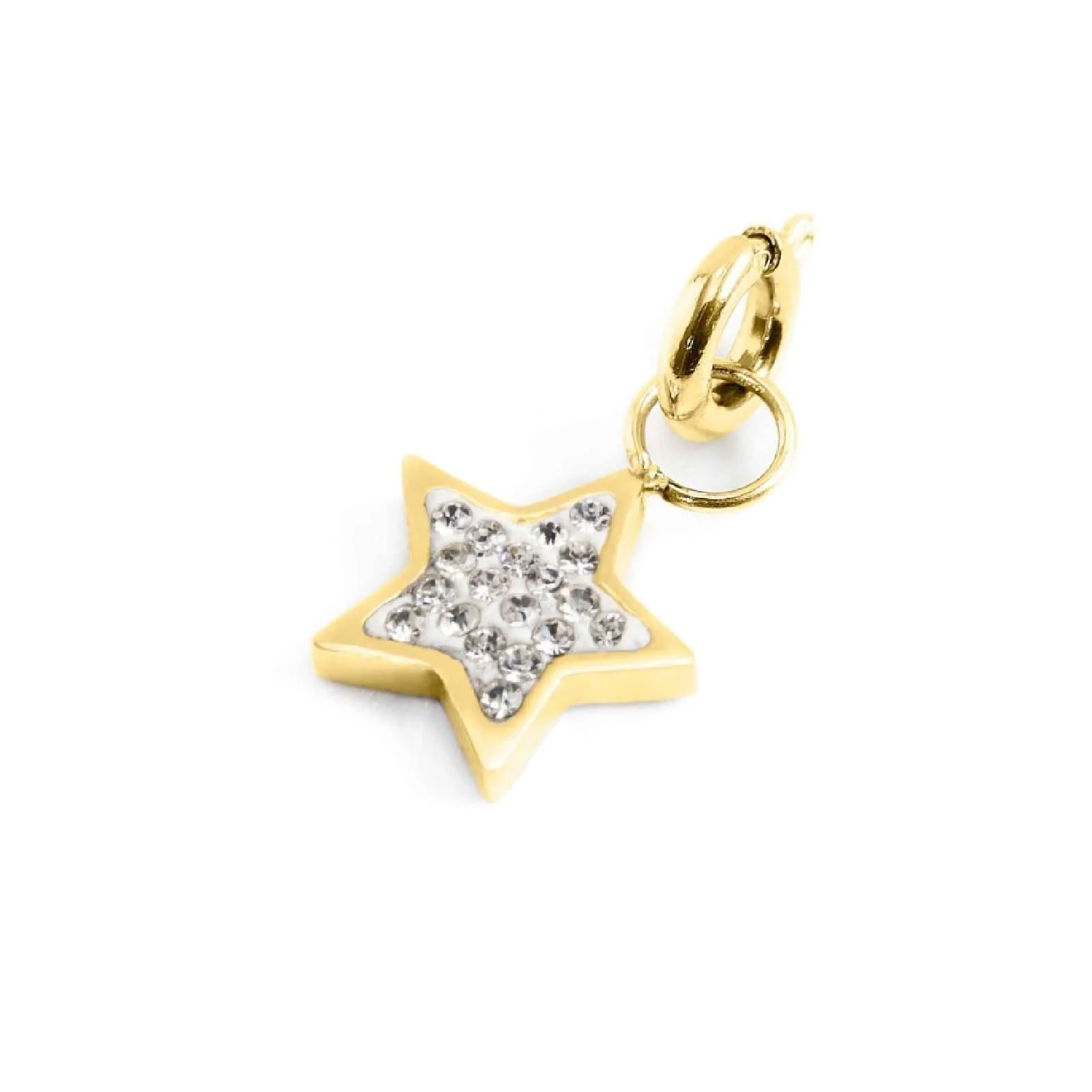 Charm in acciaio con pvd oro a forma di stella. Sul fronte la stella ha strass bianchi, sul retro è presente il logo MARLU’