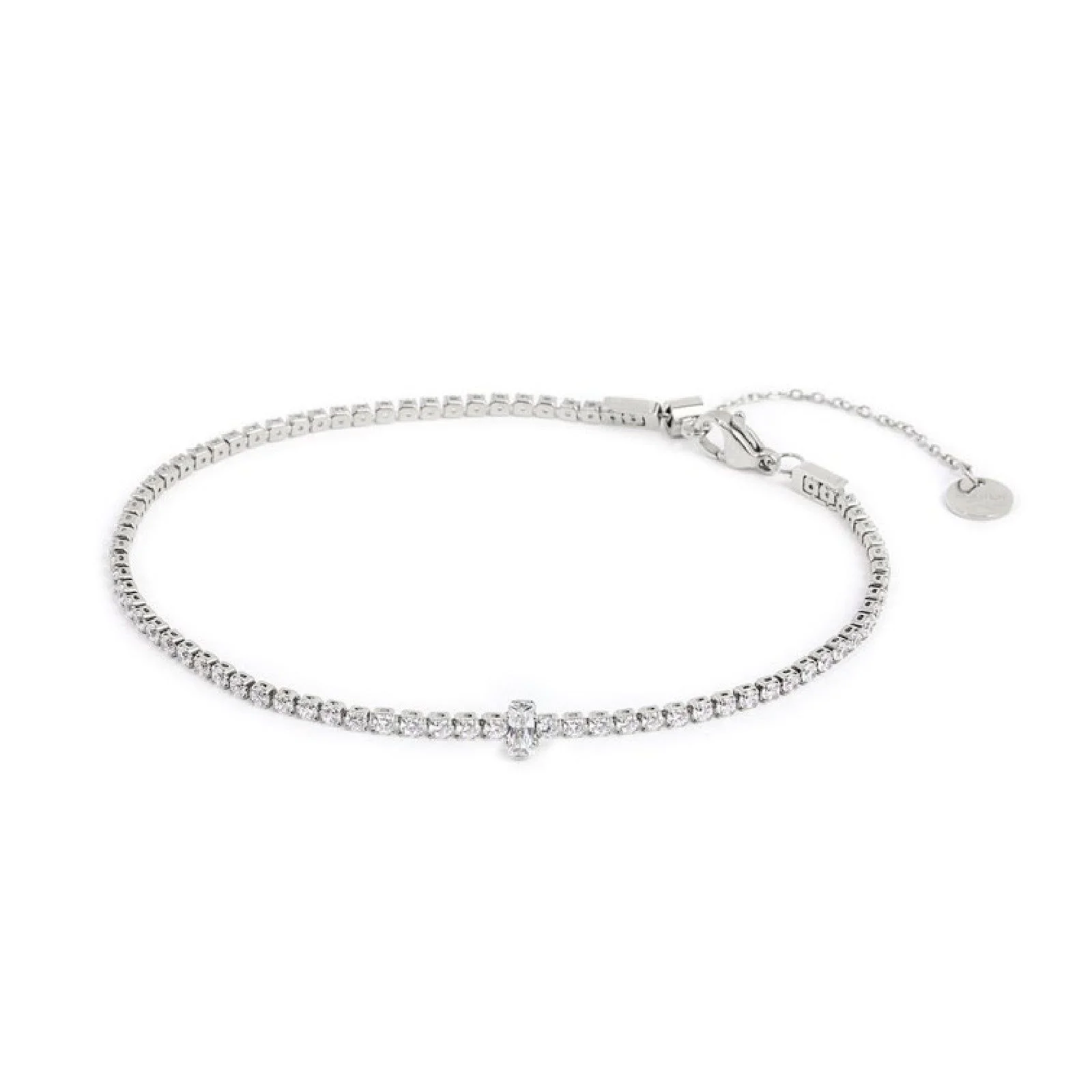 Cavigliera tennis della collezione Marlù.Colore: argento. La cavigliera è in acciaio inossidabile 316L composta da cristalli di 2 mm con al centro un cristallo baguette bianco. Lunghezza regolabile da 20 cm a 25,8 cm con chiusura a moschettone.
