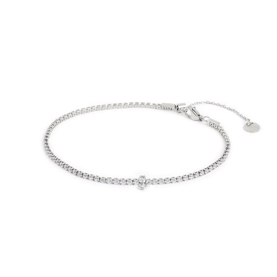 Cavigliera con cubic zirconia lungo la catena e cubic zirconia a forma di baguette al centro, che danno lucentezza. La chiusura è a moschettone.