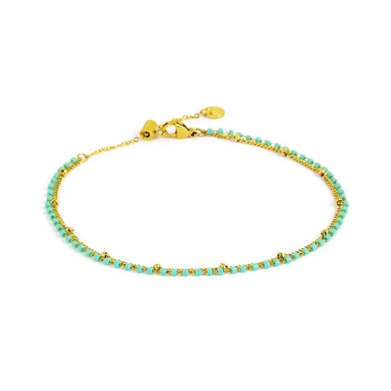 Cavigliera della collezione Marlù Summer Ankle Look da donna. Colore: argento e multicolor. La cavigliera è in acciaio inossidabile 316L composta da doppia catena: la prima è una catena a grumetta con sfere in acciaio, la seconda è composta da myuki multicolore alternati. Marlù logo tag all’estremità . Lunghezza regolabile tramite cursore da 25,8 cm a 21,3 cm, chiusura a moschettone.