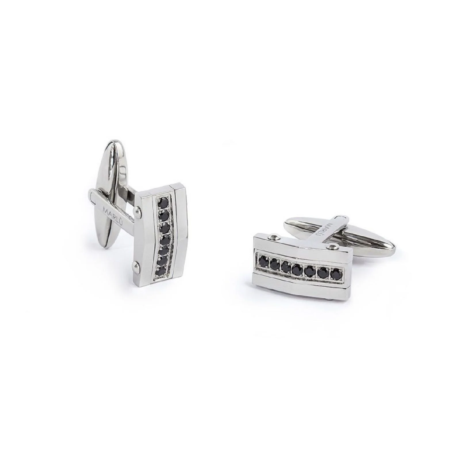 Gemelli della collezione Marlù Man da uomo. Colore: argento e nero. I gemelli sono rettangolari in acciaio inossidabile 316L impreziositi da una linea di cristalli neri. E’ presente sul lato il logo Marlù. Chiusura a torpedo.