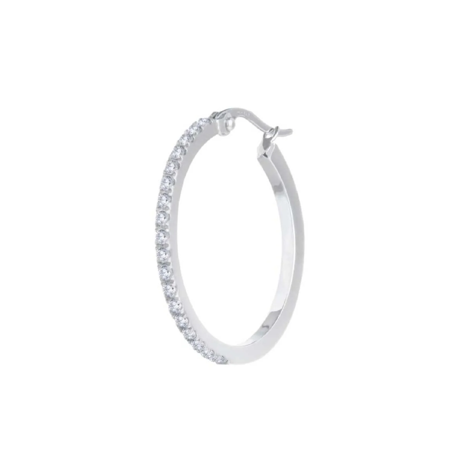 Orecchino singolo cerchio della collezione Marlù Sparkles da donna. Colore: argento. Il mono orecchino a cerchio è in acciaio inossidabile 316L con zirconi bianchi. chiusura a leva. Diametro 28,50 mm.
