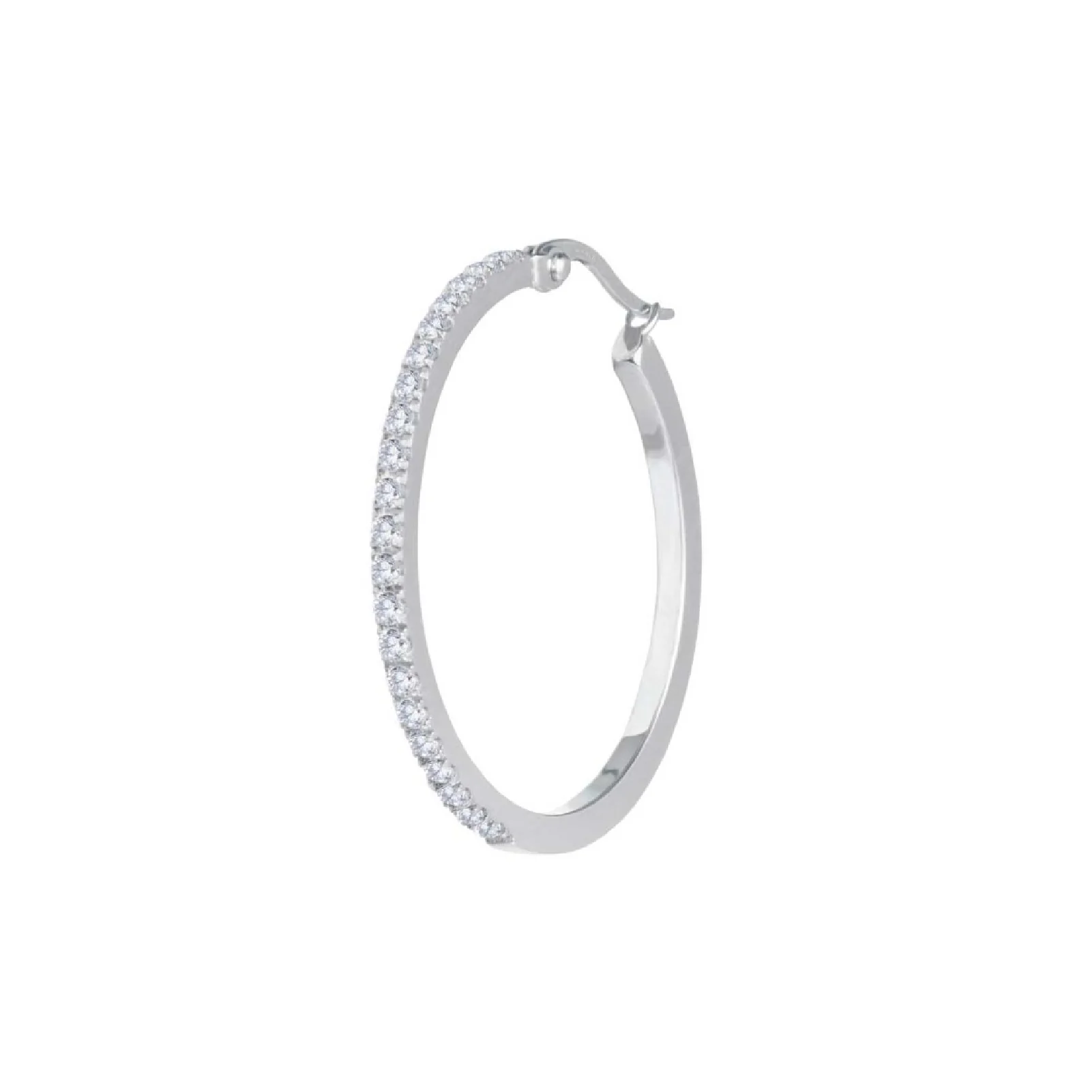 Orecchino singolo cerchio della collezione Marlù Sparkles da donna. Colore: argento. Il mono orecchino a cerchio è in acciaio inossidabile 316L con zirconi bianchi. chiusura a leva. Diametro 32 mm.
