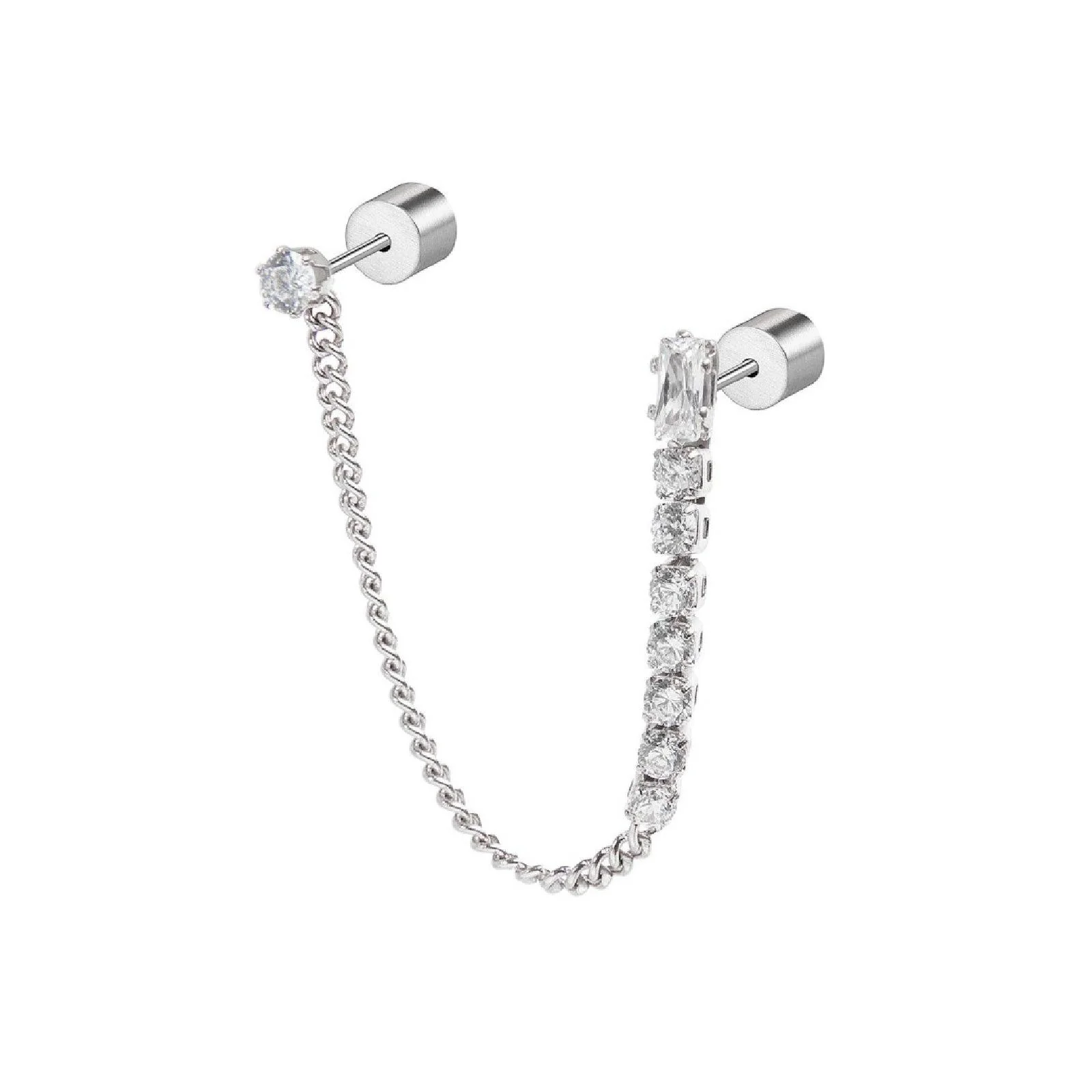Monorecchino multindosso donna marlù, collezione sparkles, in acciaio Formato da una catena a tennis con cubic zirconia, al cui vertice si trova un cubic zirconia a baguette, e da una catena a grumetta nella cui parte finale si trova il secondo orecchino, removibile, con cubic zirconia con diametro 3 mm.