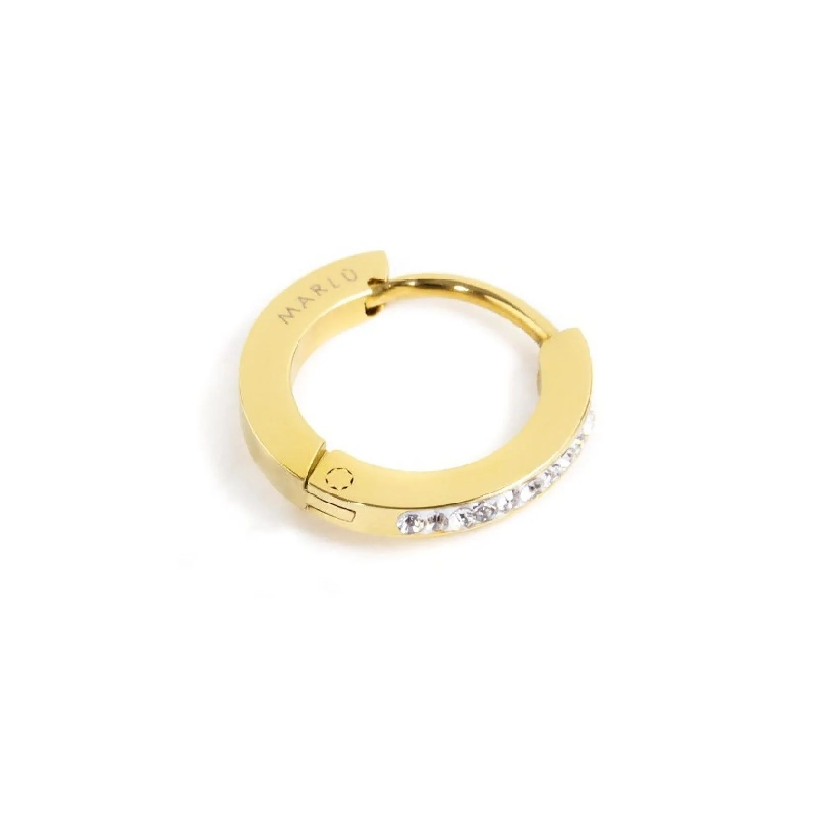 Mono orecchino a cerchio della collezione Marlù Basi da donna. Colore: argento. Il mono orecchino è in acciaio inossidabile 316L realizzato a forma di cerchio con diametro esterno di 13 mm e cristalli bianchi. Chiusura a scattino.