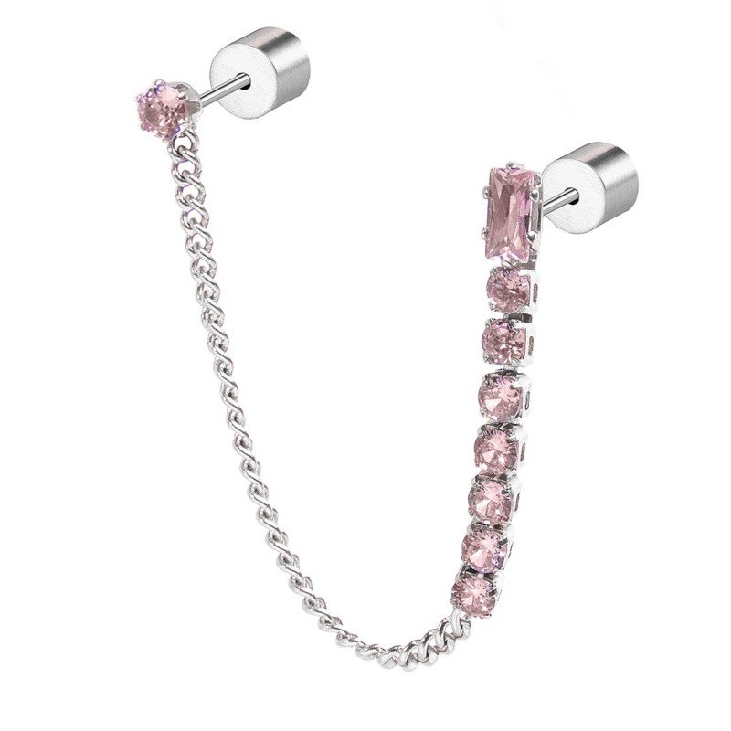 Mono orecchino con doppio orecchino. Formato da una catena a tennis con cubic zirconia, al cui vertice si trova un cubic zirconia a baguette, e da una catena a grumetta nella cui parte finale si trova il secondo orecchino, removibile, con cubic zirconia con diametro 3 mm. Lunghezza totale 6,7 cm.