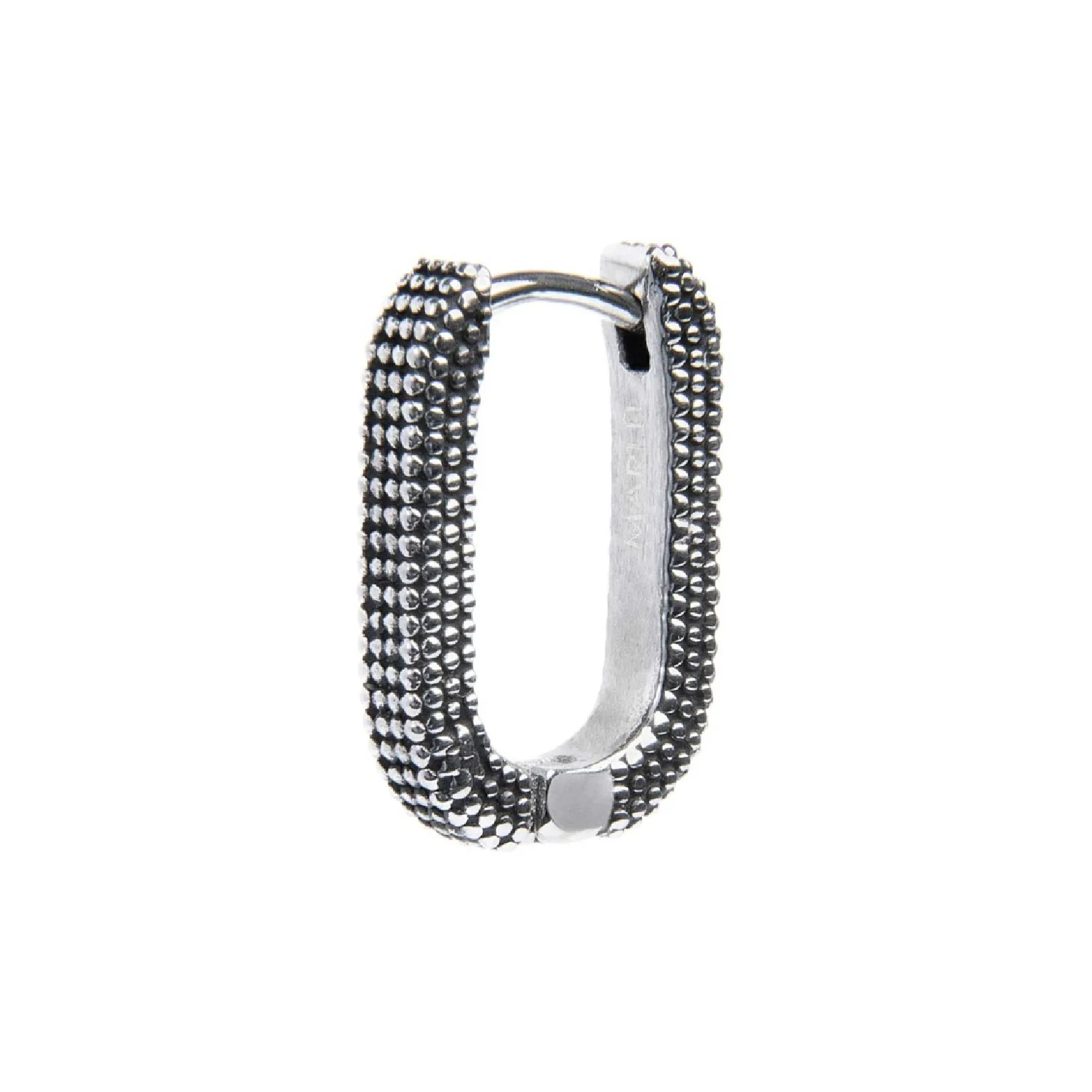 Mono orecchino in acciaio ovale 1,1*1,6 cm, con trama puntinata con black oil opaco. Chiusura a pressione. Logo Marlù laserato nella parte interna. Materiali: acciaio, black oil opaco